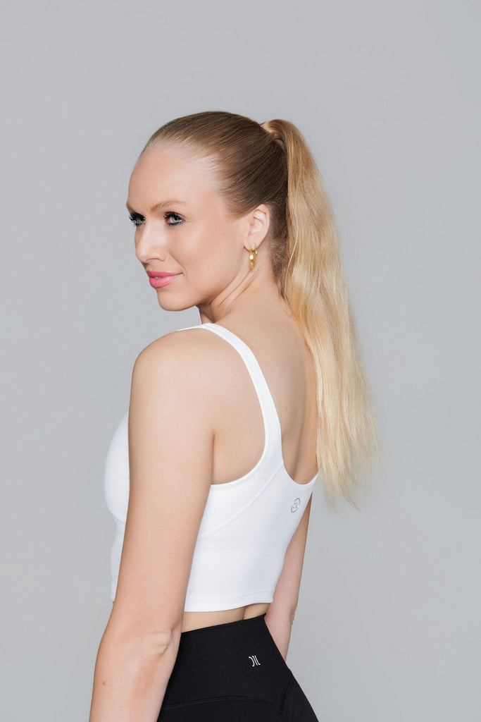 Our White Crop Top is perfect for workout or as everyday wear. Great fit, medium support and removable pads. We recommend you take your usual size.