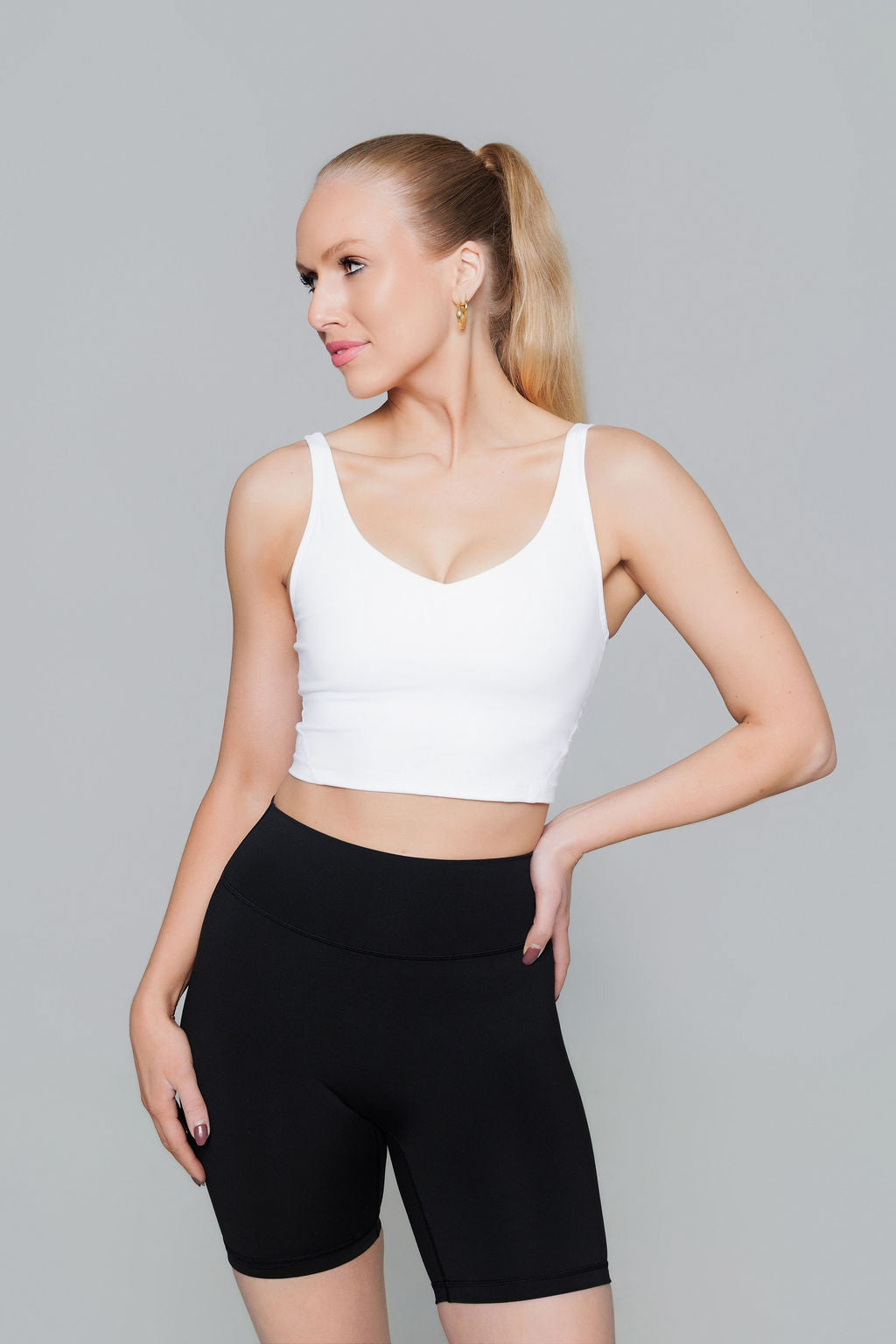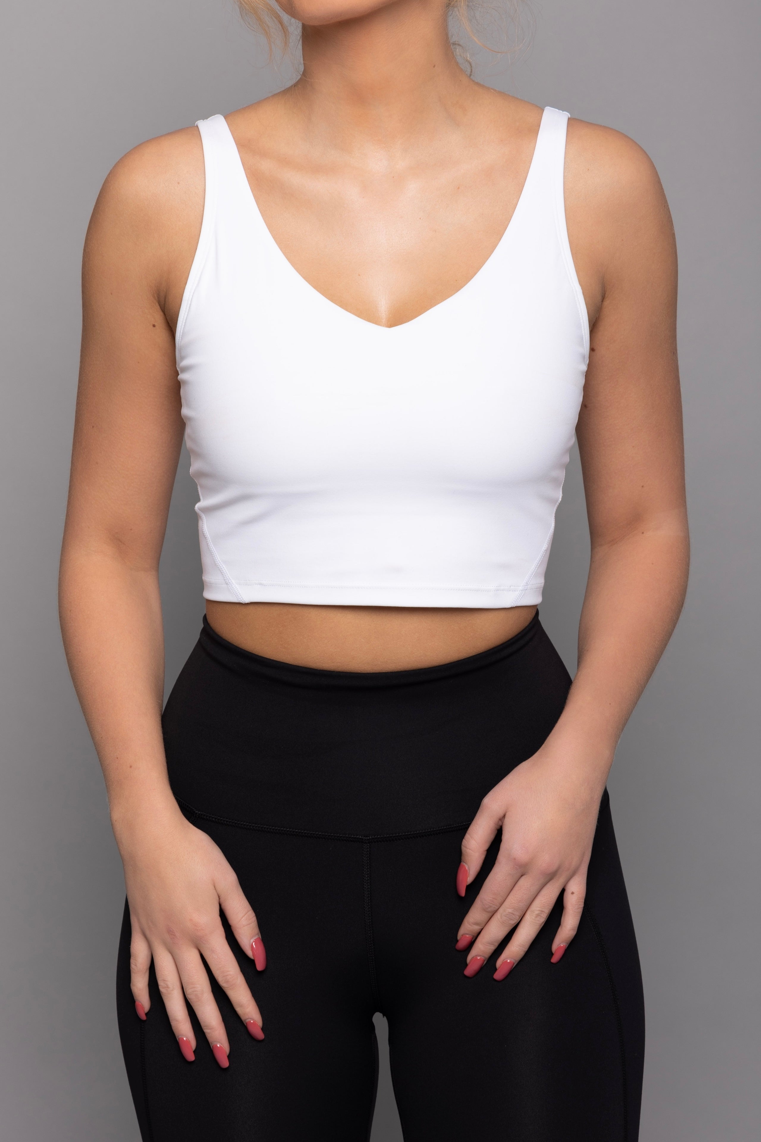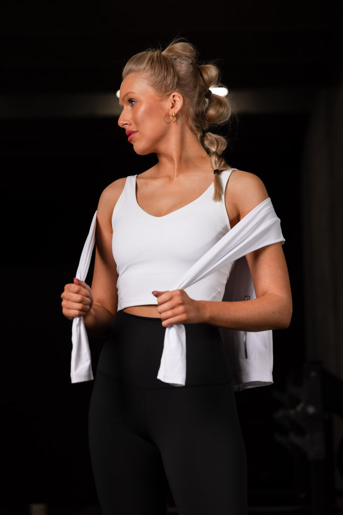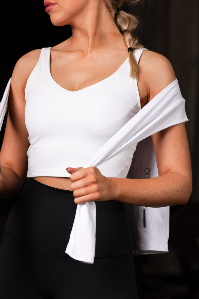 Our White Crop Top is perfect for workout or as everyday wear. Great fit, medium support and removable pads. We recommend you take your usual size.