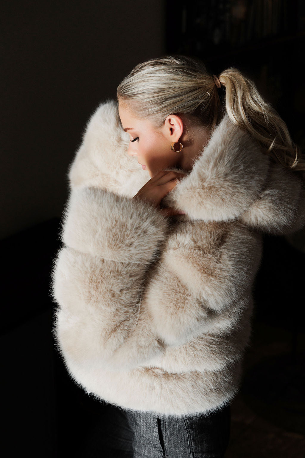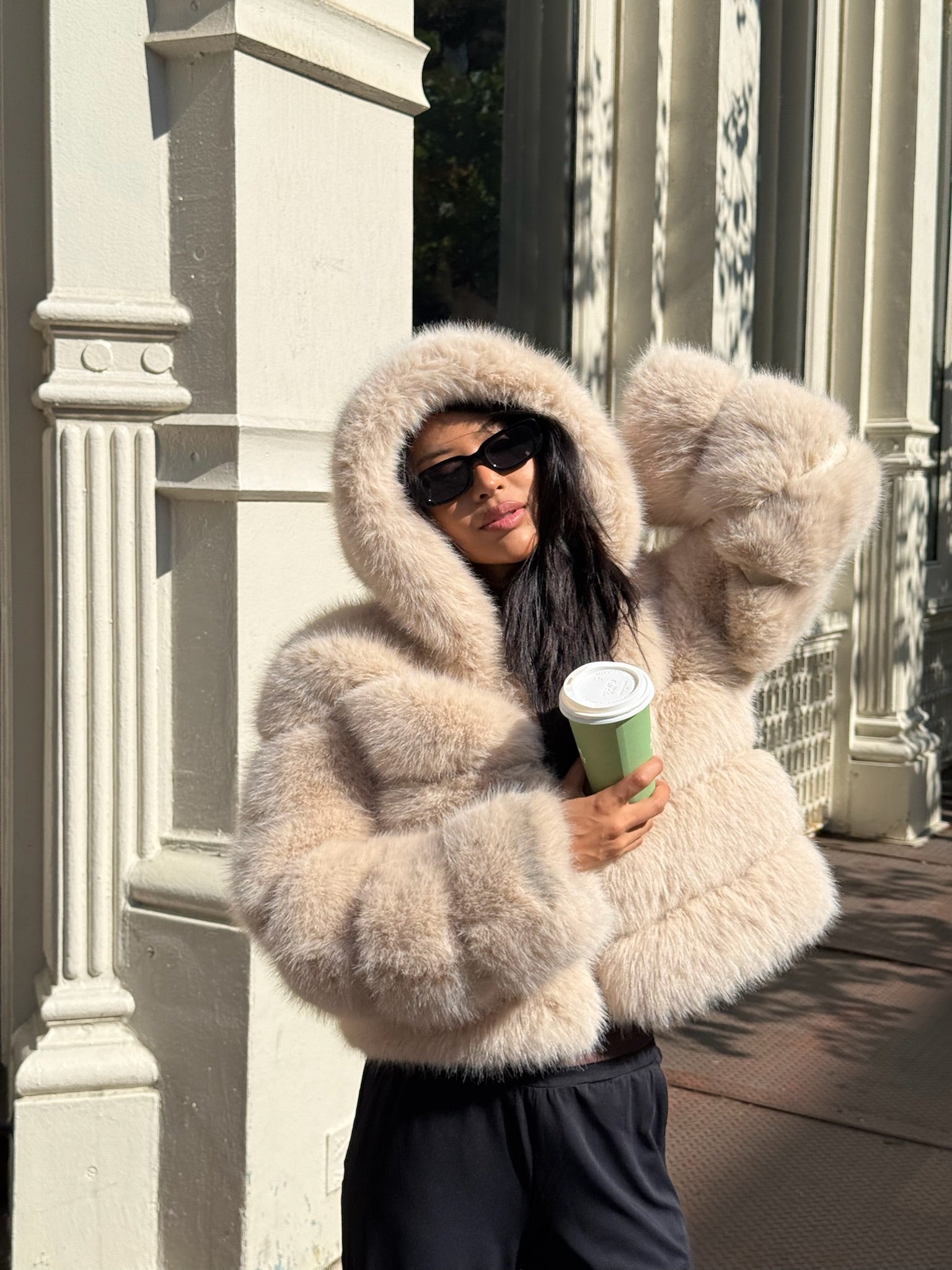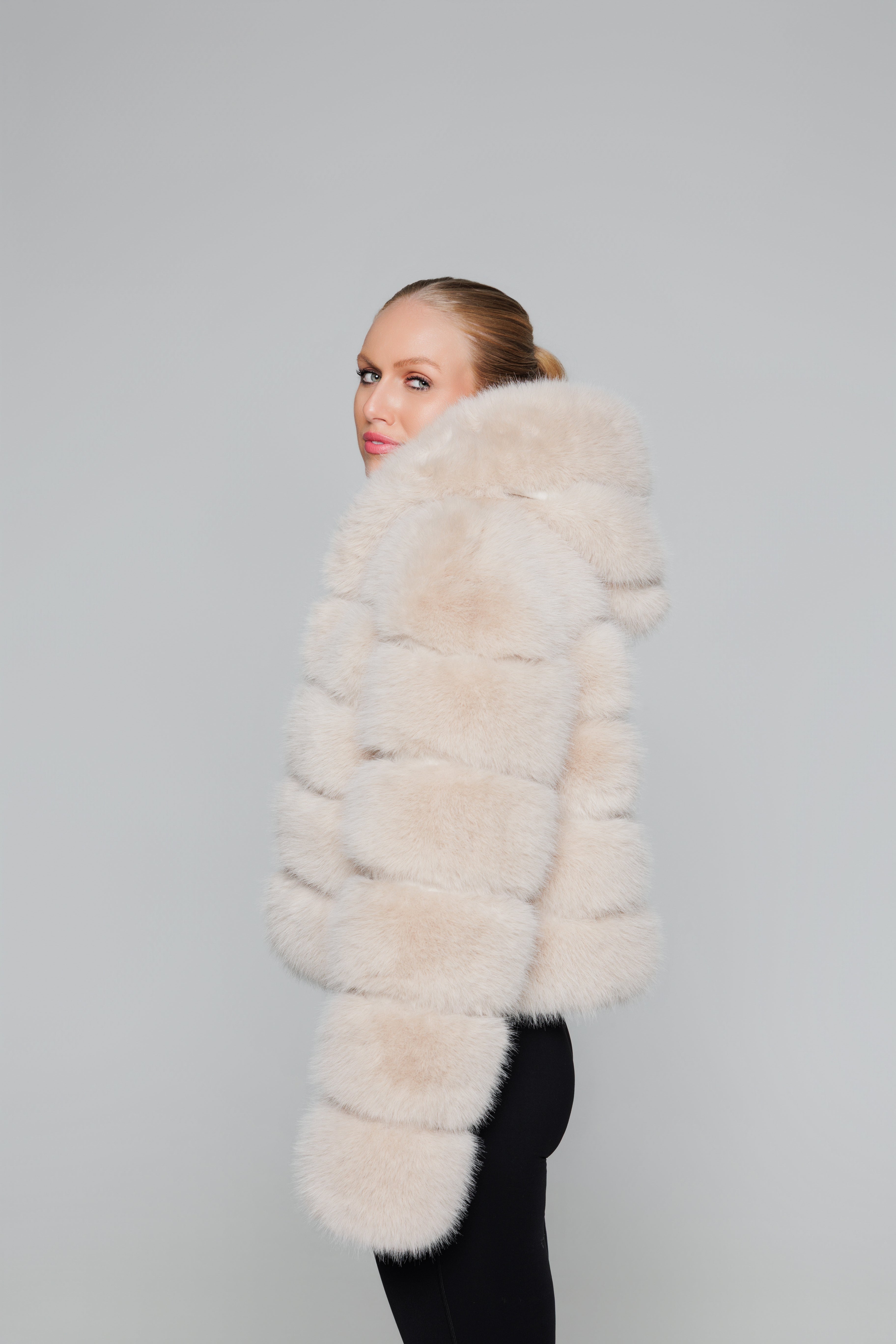 HOODED FAUX FUR JACKET - BEIGE