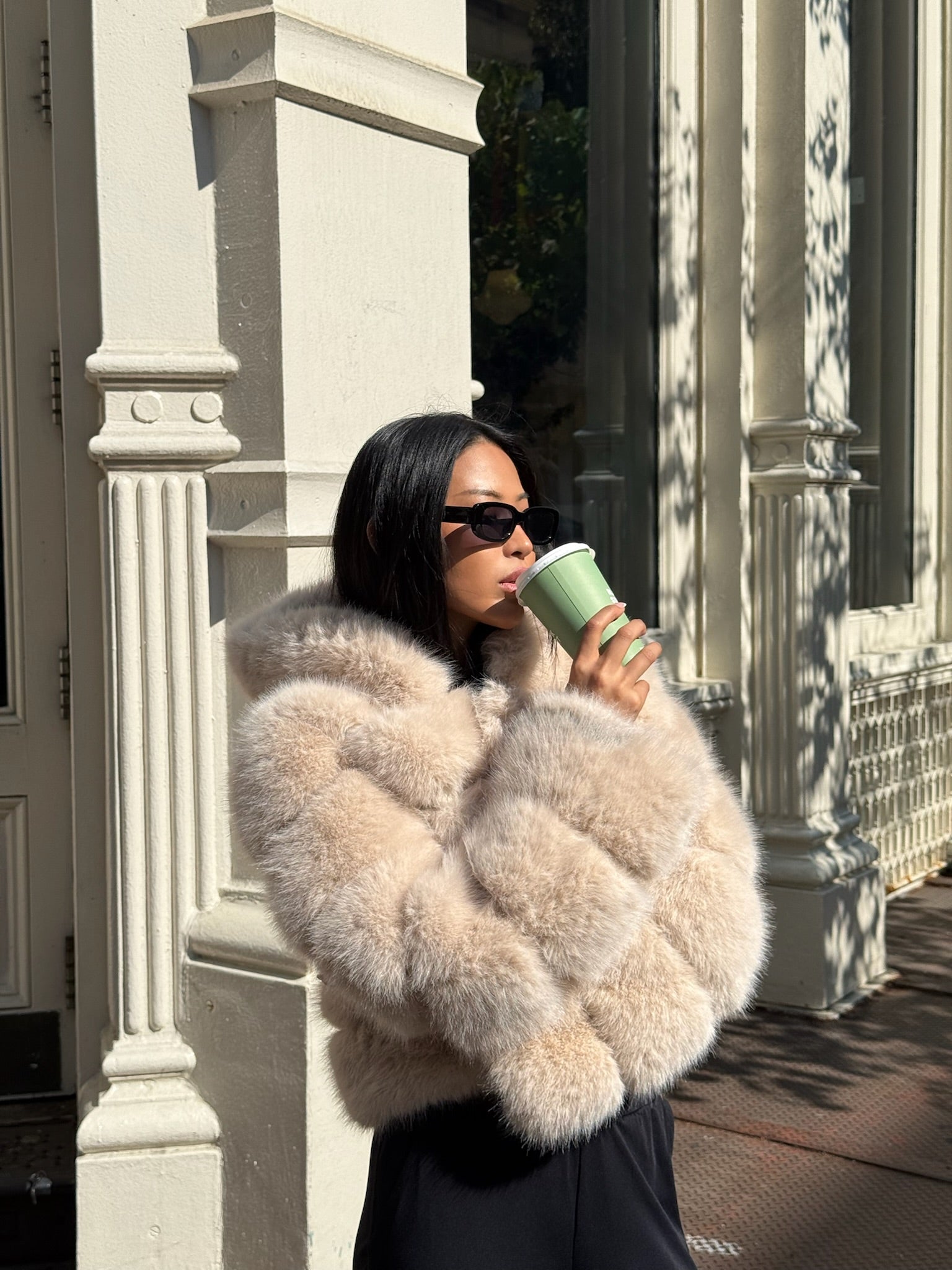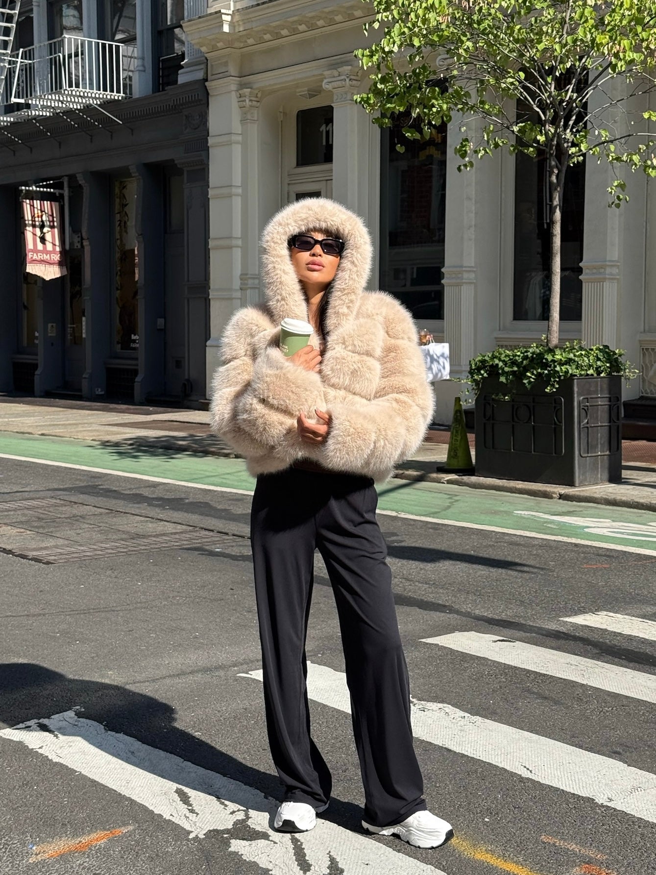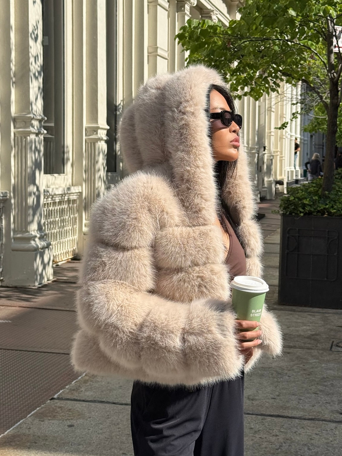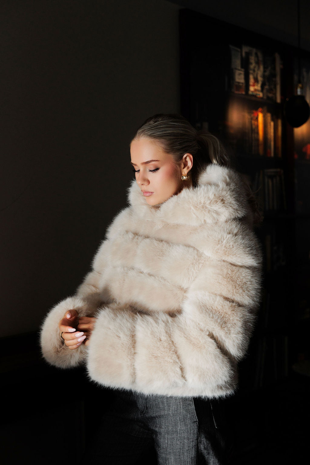 HOODED FAUX FUR JACKET - BEIGE