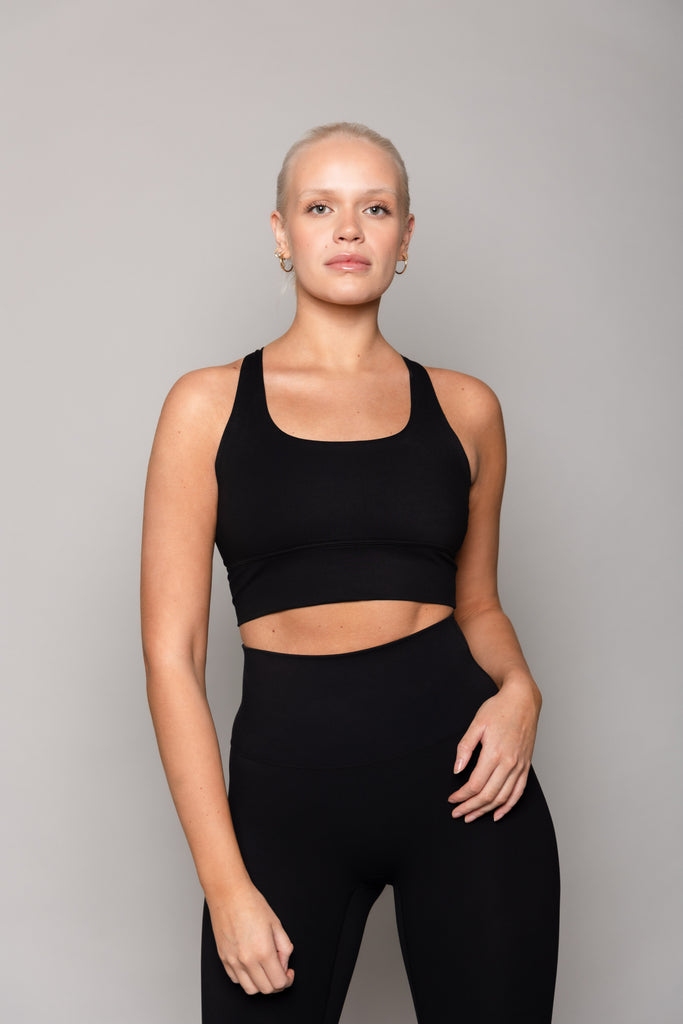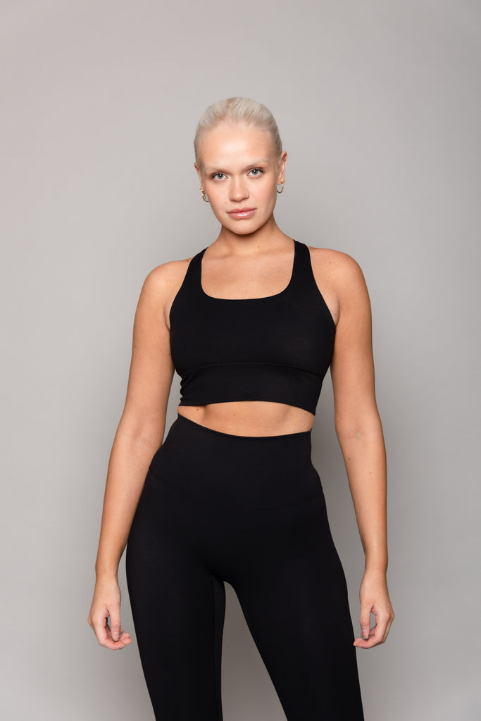 Our Black Criss Cross sports bra is ideal for wearing when exercising. Super comfortable, great fit, medium support and removable pads.